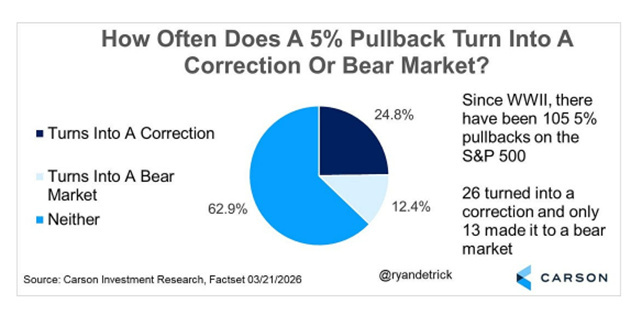 Tradotto: nel 62% dei casi, un calo del 5%… resta semplicemente un calo del 5%, poi il mercato torna a salire. Eppure ogni volta gli investitori reagiscono come se fosse l’inizio di un crollo epocale.