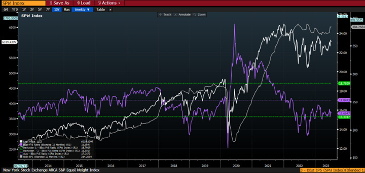 In our view it is necessary to focus on two things: prefer the equated index, choose discount sectors. Market performance so far has been driven by a few leading large companies belonging to sectors that were steeply discounted at the end of 2022, but are currently significantly more expensive. In fact, analyzing the S&P500 equated index, we note that valuations remain at a discount, highlighting that an economic slowdown is embedded in prices:
