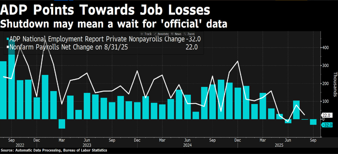 Let's start with the macro picture, where labor market data offered weak indications: the ADP report showed a loss of 32,000 jobs in the private sector in September, the worst figure since March 2023 and well below expectations.