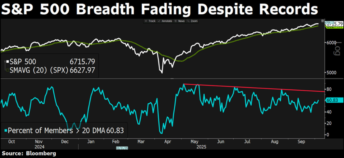 Although the S&P 500 continues to hit new highs, macro signs of weakness persist beneath the surface. Upward momentum in stocks remains fragile, with only 56% of stocks above their 50-day moving average. This suggests a narrowly led market, driven by a few names, and a widening dispersion in performance, signaling a slowdown in the upward momentum.