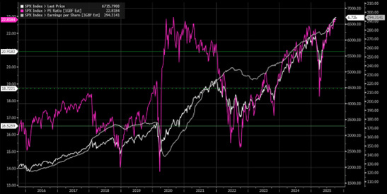 In recent months, equities have been driven by a particularly favorable earnings environment and growing confidence that the US economy has avoided recession. Despite one of the Fed's most aggressive rate hike cycles, two years of persistent inflation, and global trade tensions, the dominant narrative on Wall Street oscillates between “soft landing,” “no landing,” and even “reacceleration.”