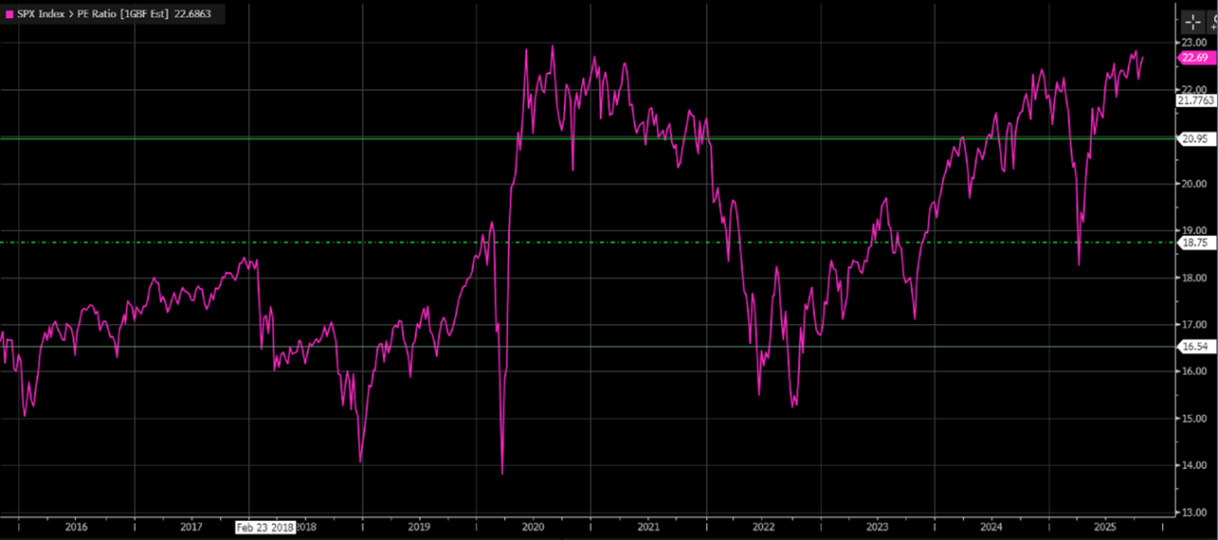 Parallelamente, il P/E forward dell’S&P 500 è risalito a 22,6 volte, molto vicino ai picchi storici. Si tratta di multipli che incorporano una fiducia elevata nella crescita futura degli utili e presuppongono una prosecuzione del ciclo senza shock esterni. Come ricordiamo ogni volta, questi livelli valutativi non implicano per forza un’imminente correzione, ma richiedono cautela. La combinazione di valutazioni tirate, leva elevata e concentrazione dei flussi su pochi settori aumenta la sensibilità del mercato a potenziali disattese.