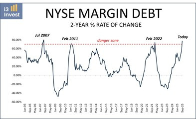 e quello sul debito a margine Americano. Il debito a margine fa riferimento al totale dei prestiti concessi agli investitori per acquistare titoli azionari a leva. Questo valore ha superato per la prima volta la soglia di 1,1 trilioni di dollari, livello che in passato — nel 2000, nel 2007 e alla fine del 2021 — ha preceduto importanti inversioni di mercato. La leva di per sé non genera crolli, ma amplifica la volatilità quando il sentiment cambia improvvisamente o la liquidità si riduce.