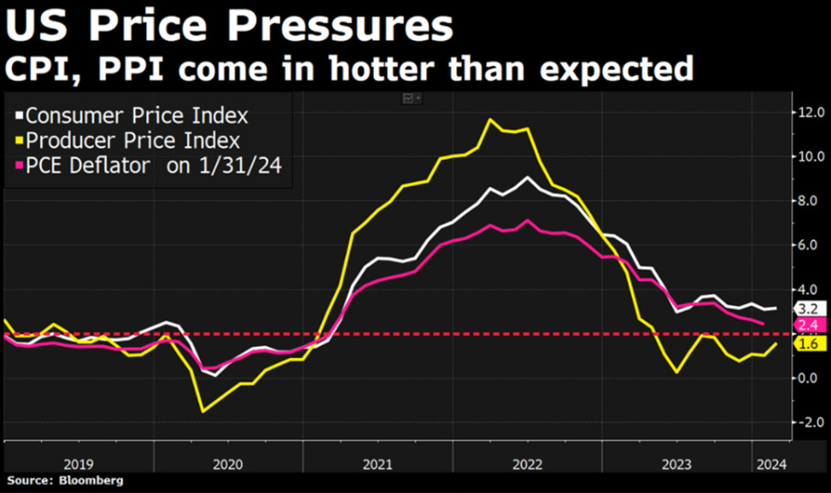 I dati macro non spostano gli equilibri, i mercati continuano a ragionare sull’idea di un trend discendente dell’inflazione, ma ad aumentare la probabilità che i tagli dei tassi della Fed siano inferiori e più tardivi di quanto la maggior parte degli investitori si aspettasse all’inizio dell’anno, ha anche contribuito il dato sull’inflazione misurata dal lato della produzione, il così detto PPI, che ha mostrato un aumento dello 0,6% m/m, il doppio del previsto.