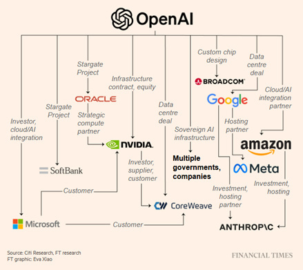 Secondo i calcoli di Goldman Sachs, OpenAI avrà bisogno di oltre 115 miliardi di dollari per finanziare i propri progetti, e l’86% di questo fabbisogno dipenderà da capitali esterni. Un’enorme ingegneria finanziaria circolare, in cui gli hyperscaler investono in OpenAI e ne diventano al contempo clienti e fornitori, alimentando una spirale di crescita che potrebbe rallentare bruscamente se anche solo uno di questi anelli si spezzasse.