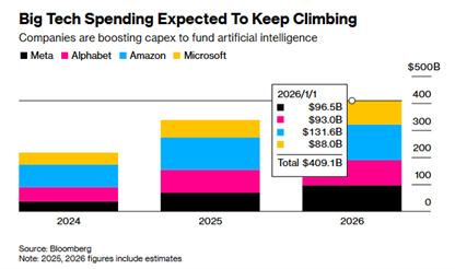 La spinta sugli investimenti in intelligenza artificiale è imponente, il solo CAPEX aggregato di Microsoft, Amazon, Alphabet e Meta è atteso in crescita da 217 miliardi nel 2024 a oltre 400 miliardi entro il 2026.