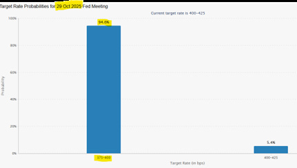 Certamente i rischi non mancano. La chiusura del governo USA è entrata nella terza settimana, bloccando la pubblicazione di dati chiave come il report sui Nonfarm Payrolls. L’assenza di nuove statistiche sul lavoro non ha però scalfito l’attesa per un nuovo taglio dei tassi da parte della Fed che il mercato prezza oggi con il 95% di probabilità nella riunione del 29 ottobre, e si aspetta due ulteriori tagli entro fine anno.