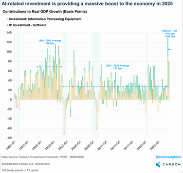 Per darci un’idea è sbalorditivo il dato che ci evidenzia che il contributo alla crescita del PIL americano nel primo semestre derivante dagli investimenti in infrastrutture AI ha quasi eguagliato la spesa dei consumatori (che storicamente contribuisce per circa il 70% della crescita americana). Un dato che non può non farci porre l’interrogativo sulla sostenibilità e durabilità di questa spinta di crescita che invece il mercato sembra stia sempre più incorporando per le crescite di lungo termine.
