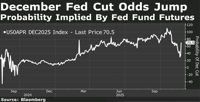 La riapertura del governo USA ha permesso la pubblicazione del report sull’occupazione di settembre, e i numeri – 119 mila nuovi lavoratori ma disoccupazione al 4,4% – raccontano una storia molto più sfumata di quanto il mercato si aspettasse. È un segnale di rallentamento, ma non abbastanza marcato da costringere la Fed a un taglio immediato. E infatti, con i dati di ottobre e novembre che arriveranno dopo il FOMC del 10 dicembre, le probabilità di un taglio sono oggi intorno al 70%, con i verbali della riunione precedente che parlano di “opinioni fortemente divergenti” all`interno del board. È un contesto in cui la politica monetaria naviga senza bussola, con una Fed che per la prima volta da anni deve decidere senza avere i dati completi.